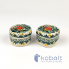 Kwadratowe pudełko z ceramiki bolesławieckiej w unikatowym wzorze.