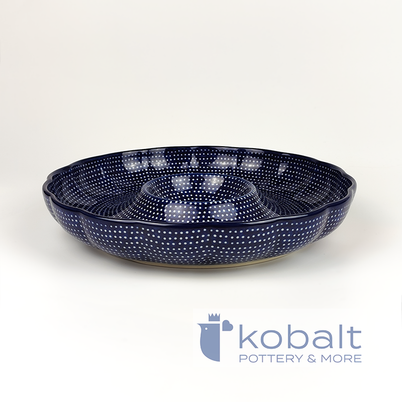 Talerz o średnicy 25 cm cm zdobiony w piękne, ręcznie malowane, granatowe kropeczki. Talerz z wgłębieniem na środku idealnie sprawdzi się do podania różnych przekąsek wraz z sosem. Ten unikatowy wzór będzie się pięknie komponować zarówno w rustykalnych jak i minimalistycznych, nowoczesnych wnętrzach. Talerz będzie stanowił oryginalną ozdobę każdej kuchni.