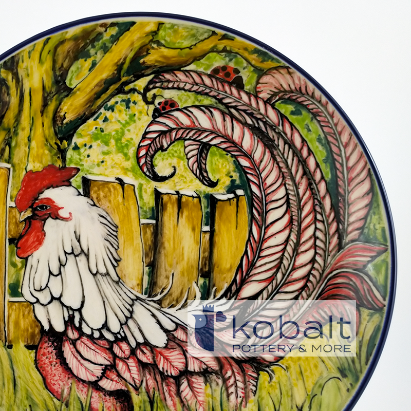 Na talerzu pięknie prezentuje się dostojny kogut przechadzający się pośród gęstej trawy, wzdłuż drewnianego płotu. Zwierzę ma bujny ogon i całe upierzenie utrzymane w czerwono-białych kolorach. W tle widnieje potężny konar drzewa wraz z innymi jasnozielonymi roślinami. Niezwykła precyzja z jaką został wykonany produkt sprawia, że przypomina on prawdziwy obraz. Z pewnością talerz będzie stanowił oryginalną i piękną ozdobę każdego wnętrza.