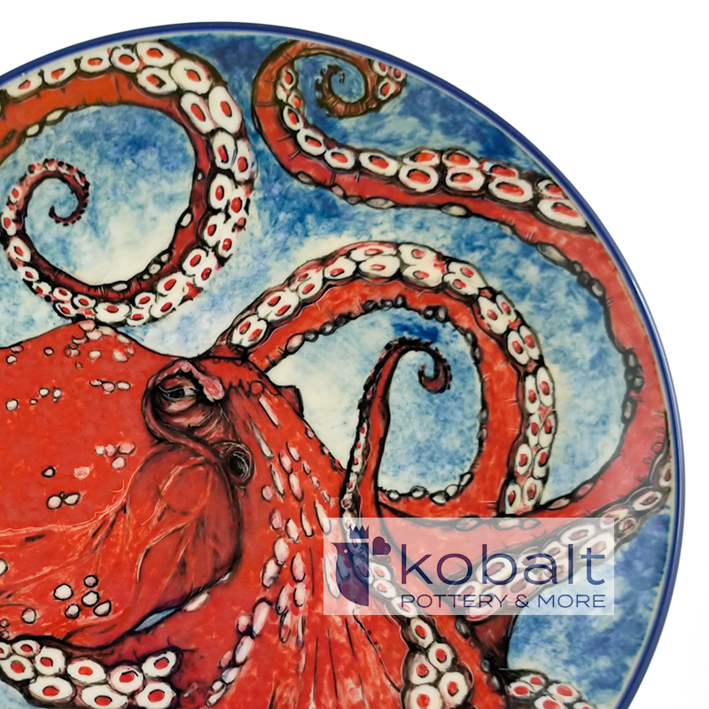 Na talerzu widzimy, nietypową dla ceramiki bolesławieckiej, dużą, czerwoną ośmiornicę ze sporą ilością biało-czerwonych macek. Dumna mieszkanka słonych wód spogląda na bok poważnym wzrokiem, sprawiając przy tym wrażenie naburmuszonej. Tło tworzą różne odcienie niebieskiego, cieniowane od bardzo jasnego aż po ciemny granat. Niezwykła precyzja z jaką został wykonany produkt sprawia, że przypomina on prawdziwy obraz. Z pewnością talerz będzie stanowił oryginalną i piękną ozdobę każdego wnętrza.