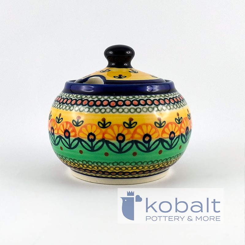 Zdobiona w piękny artystyczny wzór, idealnie łączący ze sobą odcienie żółci i zieleni. W pokrywie cukiernicy znajduje się niewielki otwór, idealny na łyżeczkę. Klasyczny kształt sprawia, że cukiernica jest praktyczna w użyciu. Świetna na osłodzenie każdego poranka. Ten artystyczny wzór będzie się pięknie komponować zarówno z rustykalnymi jak i minimalistycznymi, nowoczesnymi wnętrzami i będzie stanowić oryginalną ozdobę każdej kuchni.