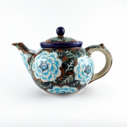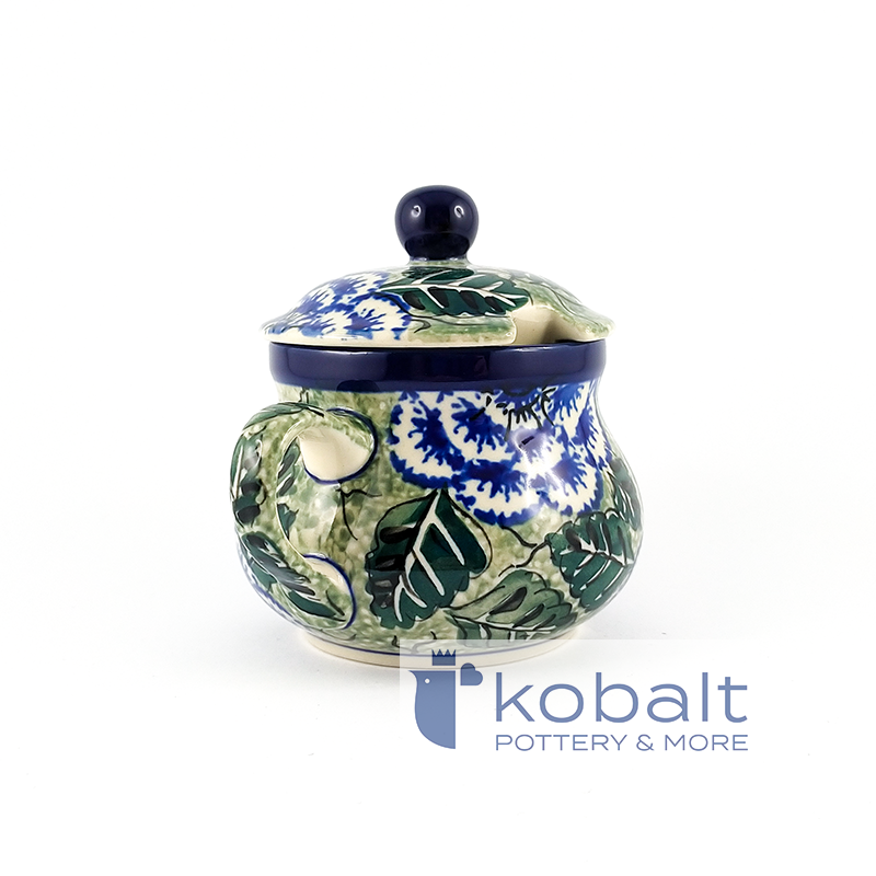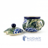Cukiernica o pojemności 300 ml i wysokości 11 cm. Zdobiona w piękne, ręcznie malowane, granatowe kwiaty na zielonym tle, z tradycyjnym kobaltowym obramowaniem. W pokrywie cukiernicy znajduje się niewielki otwór idealny na łyżeczkę. Tradycyjny kształt nie tylko przykuje oko każdego gościa, ale także sprawia, że cukiernica jest niezwykle praktyczna w użyciu. Świetna na osłodzenie każdego poranka. Ten unikatowy wzór będzie się pięknie komponować zarówno w rustykalnych jak i minimalistycznych, nowoczesnych wnętrzach i będzie stanowił oryginalną ozdobę każdej kuchni.