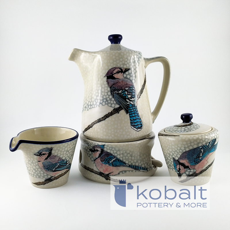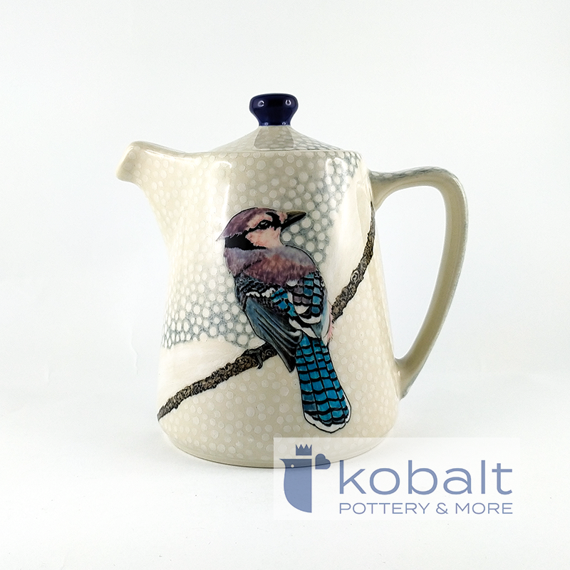 Czajnik przedstawia scenerię wprost z zimowego lasu. Widać na nim dwie piękne modrosójki błękitne, spoczywające na gałęziach. Upierzenie ptaków w odcieniach niebieskiego idealnie komponuje się z zimową aurą stanowiącą dla nich tło. Cudowne, chłodne barwy tworzą bardzo spójne połączenie i są prawdziwą ucztą dla oczu. Niezwykła precyzja z jaką został wykonany produkt sprawia, że przypomina on prawdziwy obraz. Z pewnością czajnik będzie stanowił oryginalną i piękną ozdobę każdego wnętrza.
