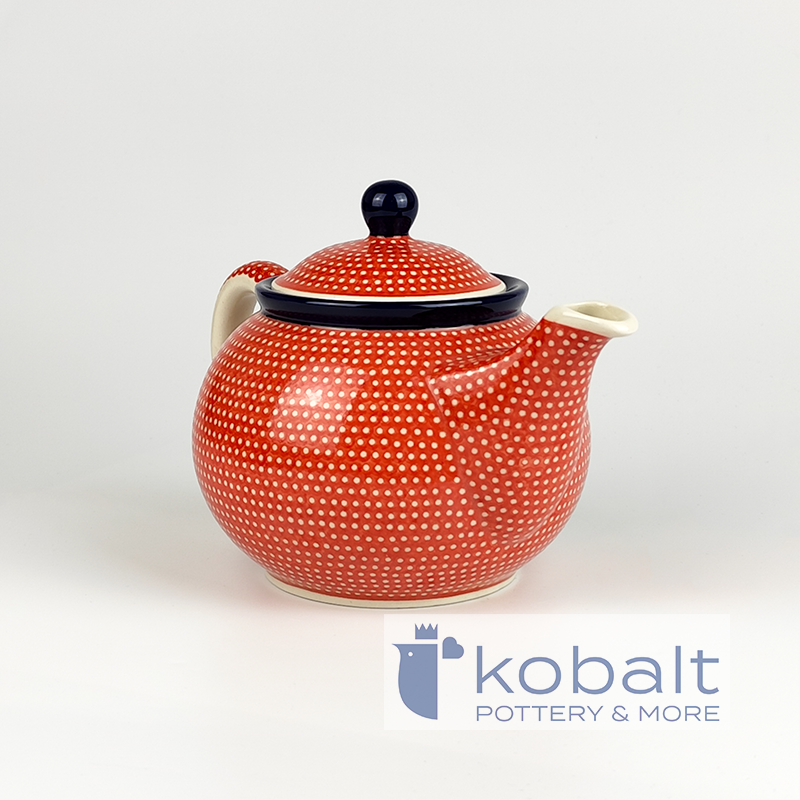 Czajnik z sitkiem o pojemności 0,9 l, zdobiony w piękne, ręcznie malowane, czerwone kropeczki, idealny do zaparzania herbaty. Rozmiar produktu jest doskonały dla jednej osoby. Czajnik będzie stanowił piękną ozdobę stołu i zachwyci każdego gościa.