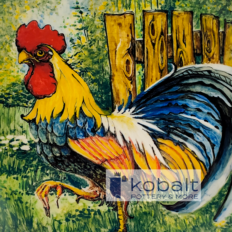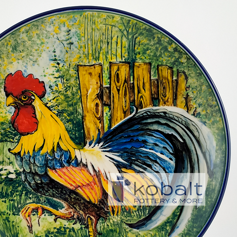 Na talerzu pięknie prezentuje się dostojny kogut przechadzający się pośród gęstej trawy, dumnie podnoszący jedną nogę. Zwierzę ma bujny, kolorowy ogon i całe upierzenie utrzymane w niebieskim, żółtym i białym kolorze. W tle widnieje bujny las, który odgrodzony jest płotem. Niezwykła precyzja z jaką został wykonany produkt sprawia, że przypomina on prawdziwy obraz. Z pewnością talerz będzie stanowił oryginalną i piękną ozdobę każdego wnętrza.
