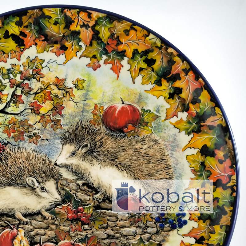 Talerz przedstawia cudną, jesienną scenerię. Głównymi bohaterami są dwa jeże, które znajdują się pośród różnych owoców i roślin, takich jak jabłka, jagody czy jarzębina. Obramowanie talerza stanowią kolorowe liście. Niezwykła precyzja z jaką został wykonany produkt sprawia, że przypomina on prawdziwy obraz. Z pewnością talerz będzie stanowił oryginalną i piękną ozdobę każdego wnętrza.