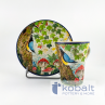 Zestaw przedstawia wyciętą scenę z wczesnojesiennego lasu. Na drzewie siedzi mała sikorka próbująca sięgnąć do czerwonych muchomorów. Całą scenę okalają opadające gałęzie pełne różnokolorowych liści. Niezwykła precyzja z jaką został wykonany produkt sprawia, że przypomina on prawdziwy obraz. Z pewnością talerz będzie stanowił oryginalną i piękną ozdobę każdego wnętrza.