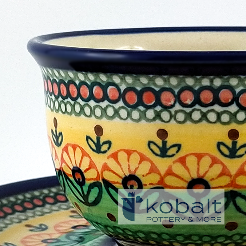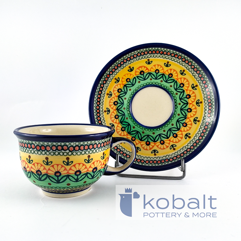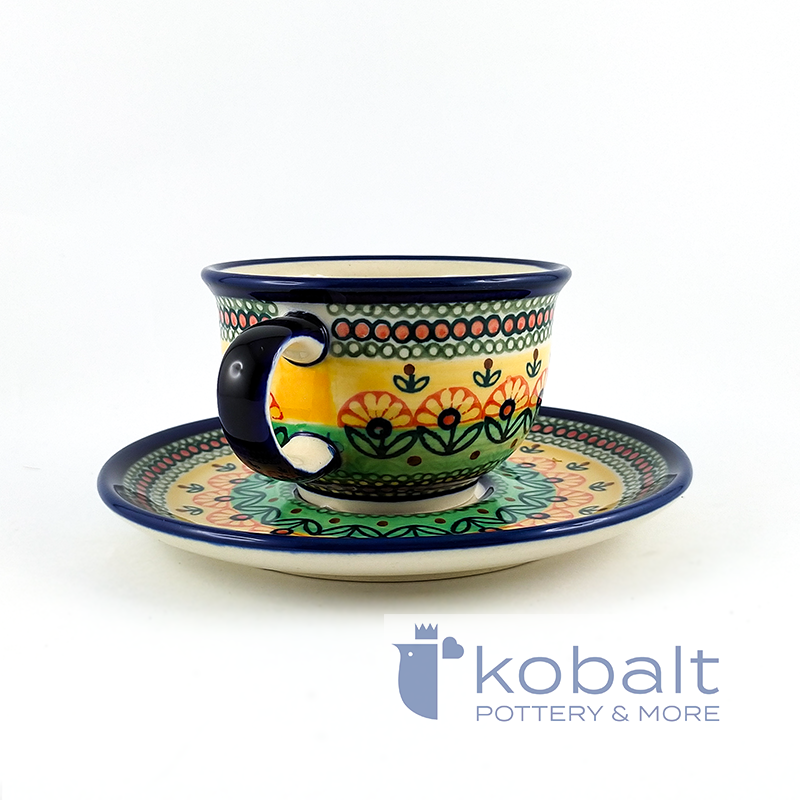 Zdobiona w piękny artystyczny wzór, idealnie łączący ze sobą odcienie żółci i zieleni. Dobrze wyprofilowane uszko sprawia, że filiżanka jest niezwykle poręczna, co zapewnia najwyższy komfort użytkowania. Idealnie nada się na poranną kawę czy herbatę na dobry początek dnia. Ten artystyczny wzór będzie się pięknie komponować zarówno z rustykalnymi jak i minimalistycznymi, nowoczesnymi wnętrzami i będzie stanowić oryginalną ozdobę każdej kuchni.