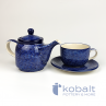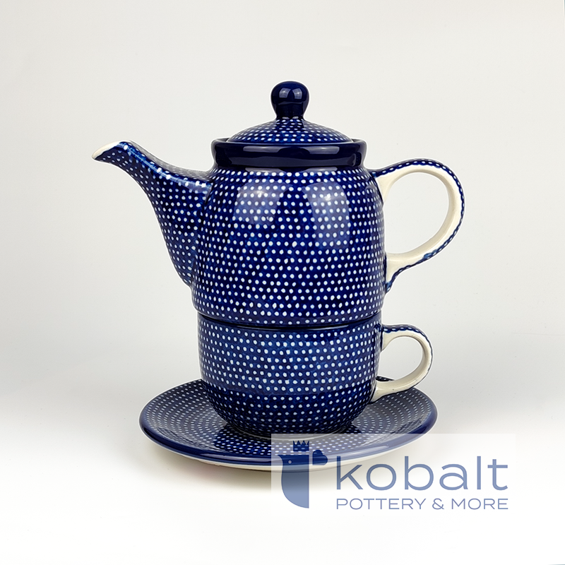 Czajnik o pojemności 500 ml idealnie wpasowujący się w filiżankę o pojemności 200 ml oraz spodek zdobiony w piękne, ręcznie malowane, granatowe kropeczki. Komplet idealnie sprawdzi się do podawania gorących napojów, a kompaktowy sposób przechowywania sprawia efektowne wrażenie. Ten unikatowy wzór będzie się pięknie komponować zarówno w rustykalnych jak i minimalistycznych, nowoczesnych wnętrzach. Komplet będzie stanowił oryginalną ozdobę każdej kuchni.