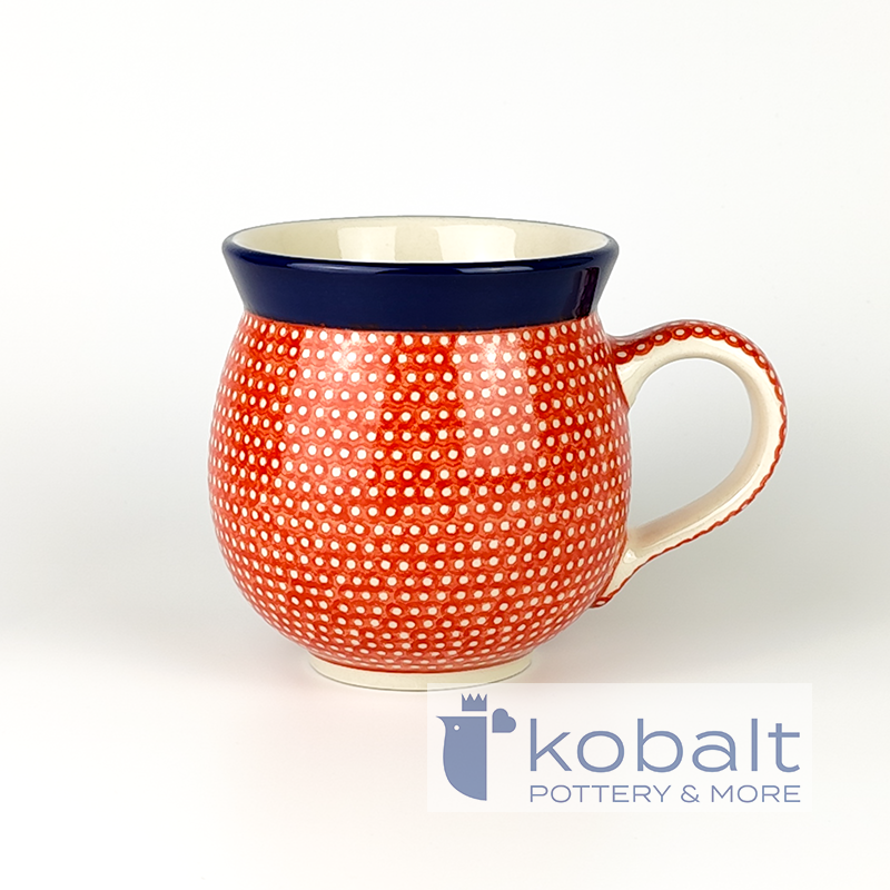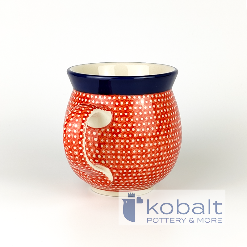 Kubek baryłka (kubek czeski) zdobiony w piękne, ręcznie malowane, czerwone kropeczki. Ten unikatowy wzór będzie się pięknie komponować zarówno w rustykalnych jak i minimalistycznych, nowoczesnych wnętrzach. Kubek będzie stanowił oryginalną ozdobę każdej kuchni.