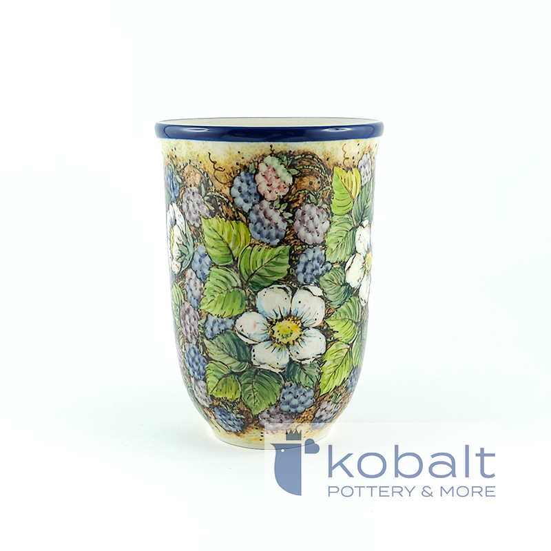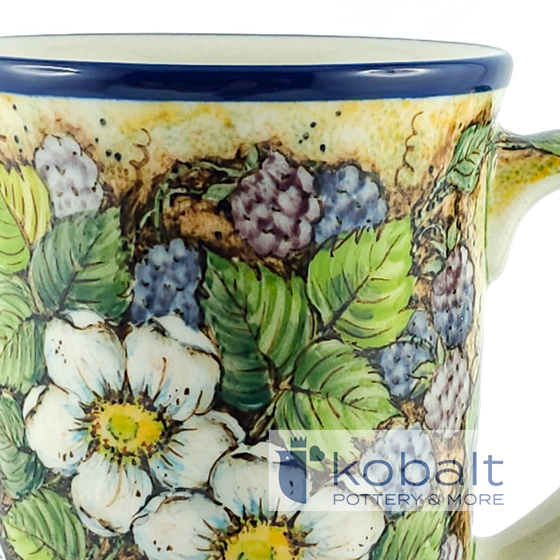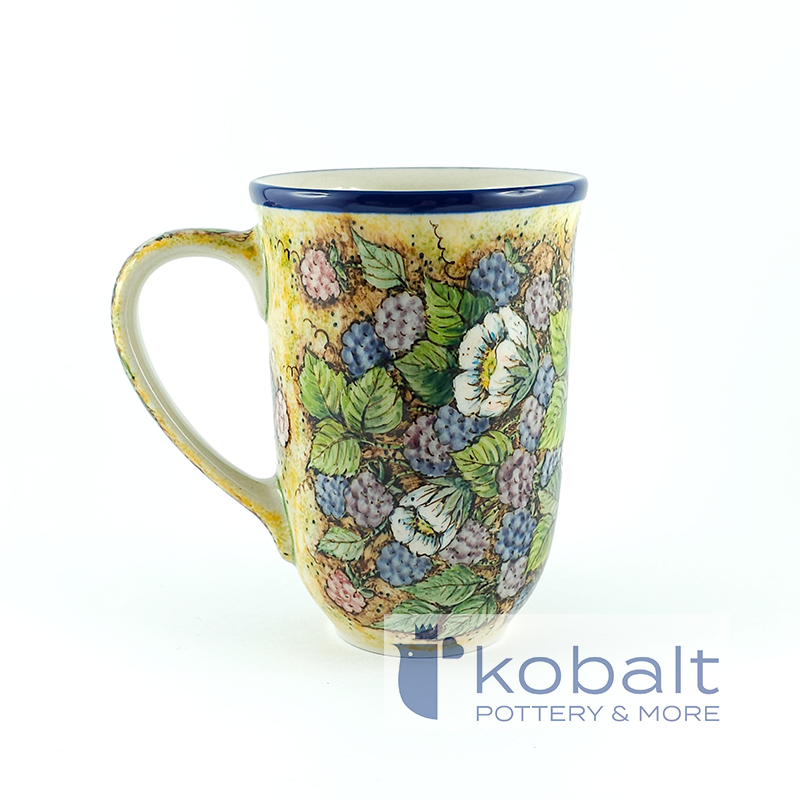 Kubek przedstawia niezwykle piękne połączenie kwiatów z owocami jeżyny. Na sam widok przychodzi na myśl słoneczny, letni dzień. Cudowne, ciepłe barwy idealnie razem współgrają i są prawdziwą ucztą dla oczu. Niezwykła precyzja z jaką został wykonany produkt sprawia, że przypomina on prawdziwy obraz. Z pewnością kubek będzie stanowił oryginalną i piękną ozdobę każdego wnętrza.