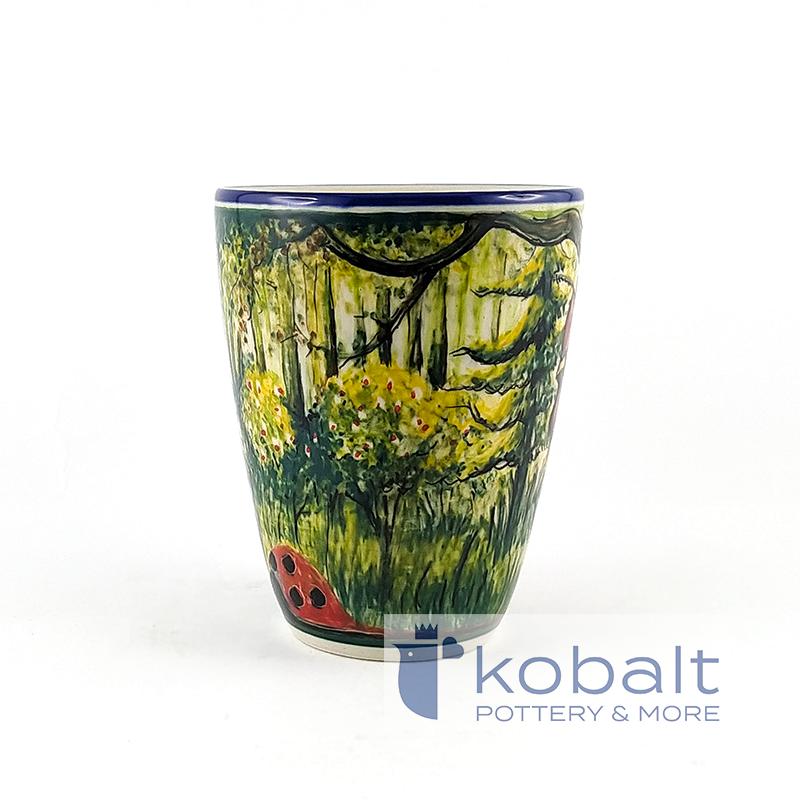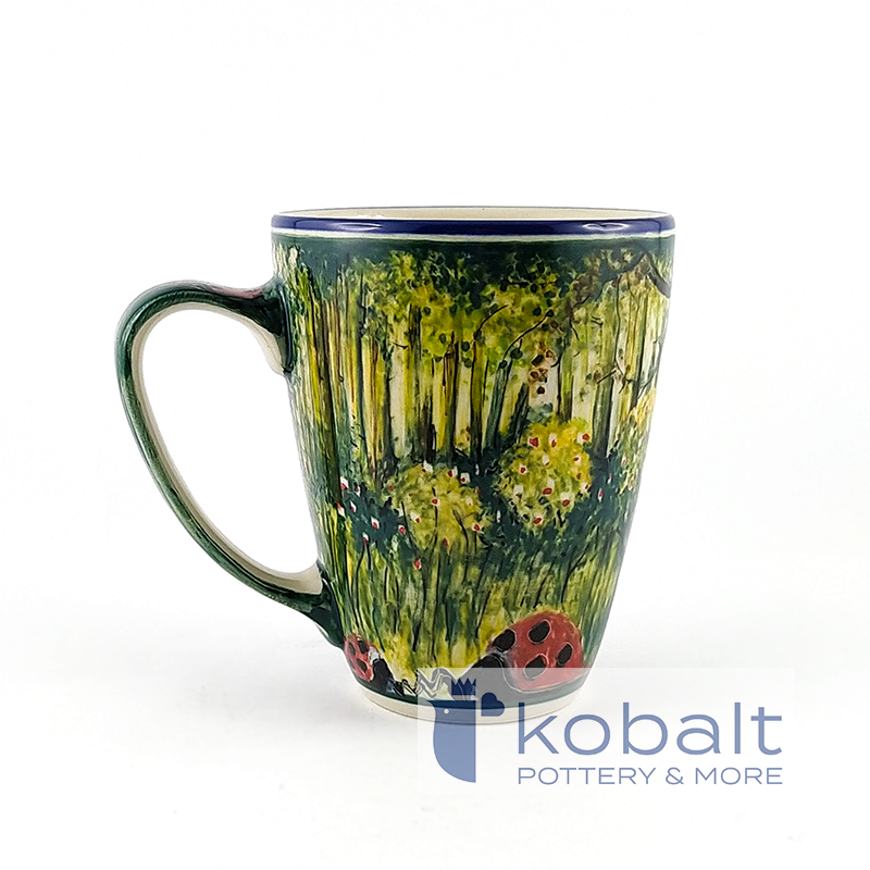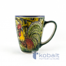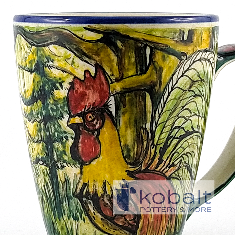 Kubek przedstawia scenę wyjętą wprost z polskiej wsi, dostojny kogut przechadzający się pośród drzew. Ptak spogląda dumnie przed siebie z lekko podniesioną głową. Na kubku dostrzec możemy także piękną biedronkę. Tło dla bohaterów tworzy piękna, zielona roślinność, wśród której rosną rozłożyste drzewa. Wykorzystane ciepłe barwy idealnie ze sobą współgrają i są prawdziwą ucztą dla oczu. Niezwykła precyzja z jaką został wykonany kubek sprawia, że przypomina on prawdziwy obraz. Z pewnością produkt będzie stanowił oryginalną i piękną ozdobę każdego wnętrza.