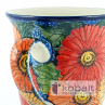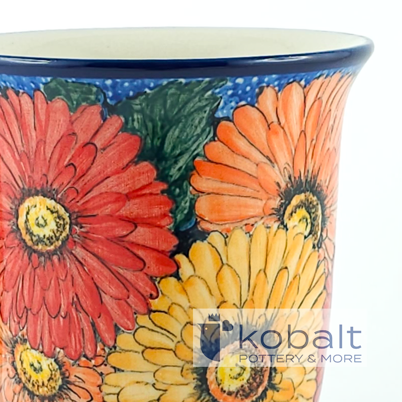 Kubek przedstawia cudowne, rozłożyste czerwone, pomarańczowe oraz żółte kwiaty, które pięknie komponują się z kobaltowym tłem. Wykorzystane ciepłe, wyraziste barwy idealnie ze sobą współgrają i są prawdziwą ucztą dla oczu. Niezwykła precyzja z jaką został wykonany kubek sprawia, że przypomina on prawdziwy obraz. Z pewnością produkt będzie stanowił oryginalną i piękną ozdobę każdego wnętrza.