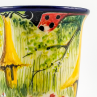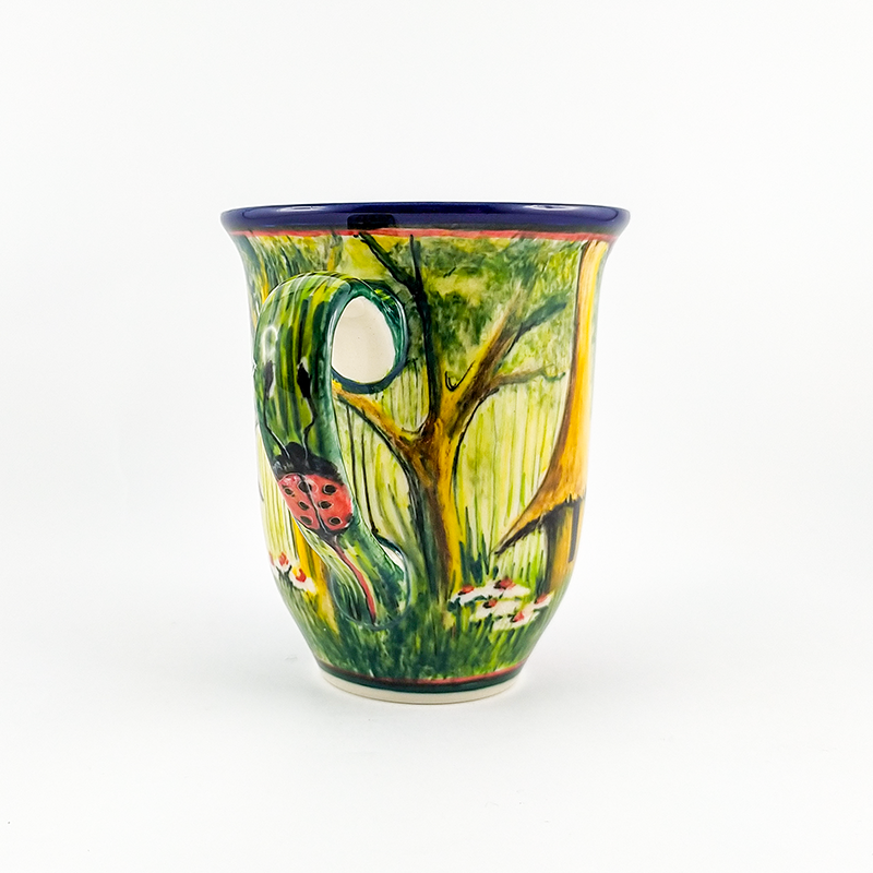 Kubek przedstawia piękne ule w złocistym kolorze, pośród nich rosną drobne kwiaty. U góry i na dole można dostrzec nieduże, czerwone biedronki. Tło stanowią bujne rośliny oraz drzewa. Ciepłe kolory idealnie ze sobą współgrają i są prawdziwą ucztą dla oczu. Niezwykła precyzja z jaką został wykonany kubek sprawia, że przypomina on prawdziwy obraz. Z pewnością produkt będzie stanowił oryginalną i piękną ozdobę każdego wnętrza.
