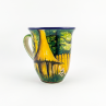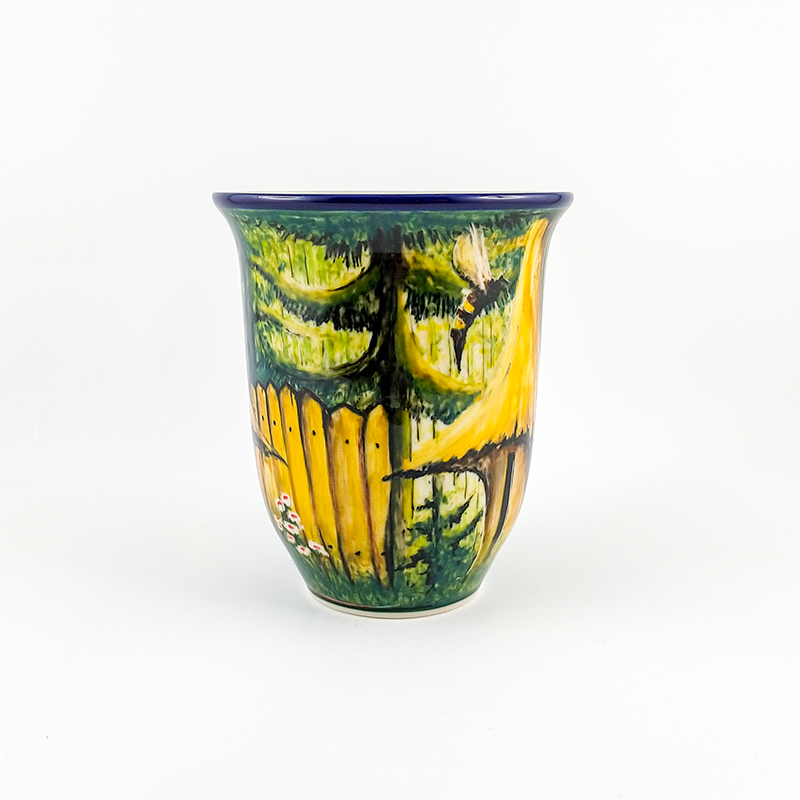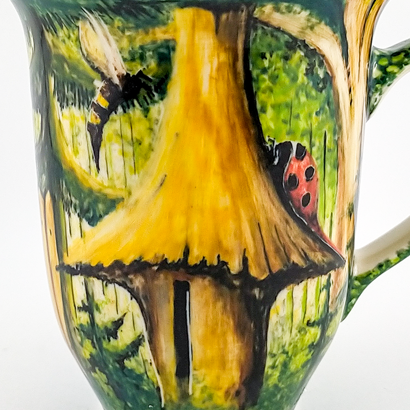 Kubek przedstawia piękne ule w złocistym kolorze. Po jednej chatce wspina się czerwona biedronka, a w stronę drugiej leci jej mieszkanka - pszczoła. W tle widać duży płot, niewielkie kwiaty oraz bujne rośliny i drzewa. Ciepłe kolory idealnie ze sobą współgrają i są prawdziwą ucztą dla oczu. Niezwykła precyzja z jaką został wykonany kubek sprawia, że przypomina on prawdziwy obraz. Z pewnością produkt będzie stanowił oryginalną i piękną ozdobę każdego wnętrza.