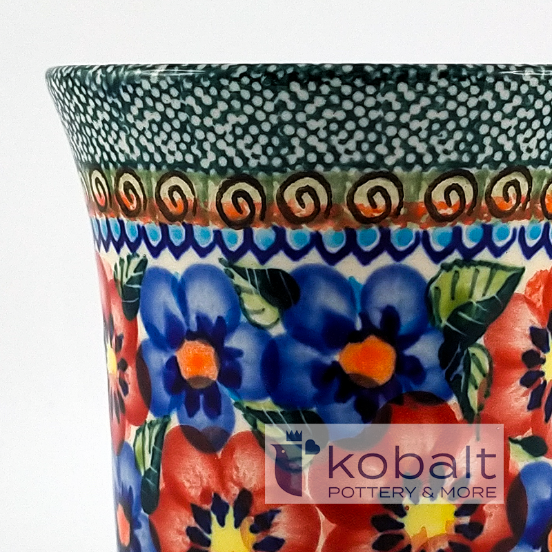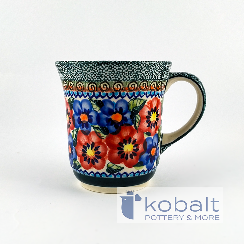 Zdobiony w piękny artystyczny wzór, idealnie łączący ze sobą czerwono-niebieskie kwiaty z odcieniami zieleni. Dobrze wyprofilowane uszko sprawia, że kubek jest niezwykle poręczny, co zapewnia najwyższy komfort użytkowania. Idealnie nada się na poranną kawę czy herbatę na dobry początek dnia. Ten artystyczny wzór będzie się pięknie komponować zarówno z rustykalnymi jak i minimalistycznymi, nowoczesnymi wnętrzami i będzie stanowić oryginalną ozdobę każdej kuchni.