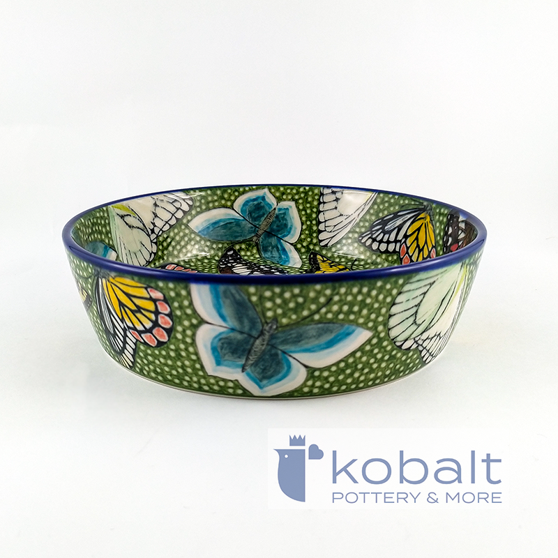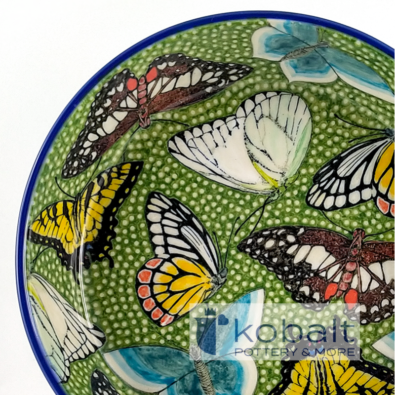 Miska przedstawia cudowne, kolorowe motyle na idealnie kontrastującym zielonym tle. Barwy tworzą bardzo spójne połączenie i są prawdziwą ucztą dla oczu. Niezwykła precyzja z jaką został wykonany produkt sprawia, że przypomina on prawdziwy obraz. Z pewnością miska będzie stanowiła oryginalną i piękną ozdobę każdego wnętrza.