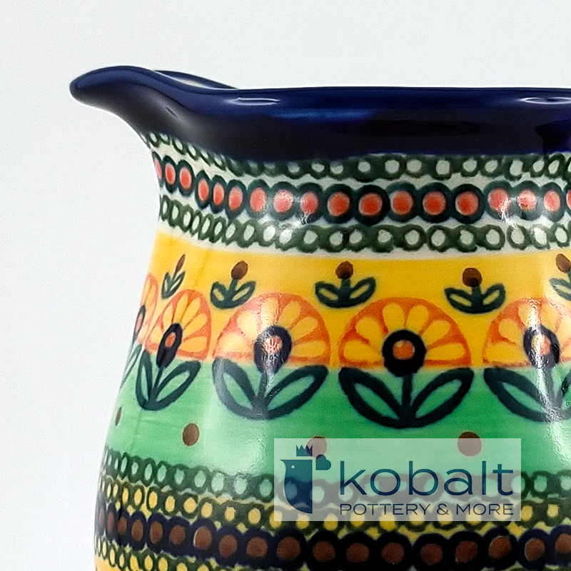 Zdobiony w piękny artystyczny wzór, idealnie łączący ze sobą odcienie żółci i zieleni. Idealny na mleko, jako towarzysz porannej kawy na dobry początek dnia. Ten artystyczny wzór będzie się pięknie komponować zarówno z rustykalnymi jak i minimalistycznymi, nowoczesnymi wnętrzami i będzie stanowić oryginalną ozdobę każdej kuchni.
