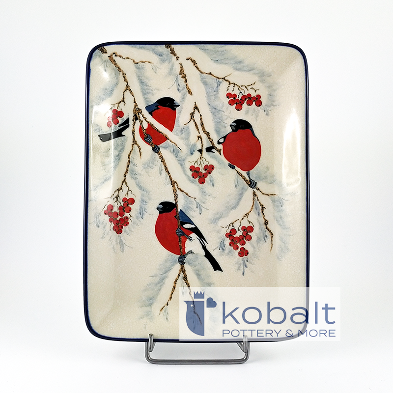 Taca przedstawia trzy piękne, zimowe gile, idealnie komponujące się z jarzębiną na zaśnieżonych gałęziach. Cudowne, chłodne barwy tworzą bardzo spójne połączenie i są prawdziwą ucztą dla oczu. Niezwykła precyzja z jaką został wykonany produkt sprawia, że przypomina on prawdziwy obraz. Z pewnością taca będzie stanowiła oryginalną i piękną ozdobę każdego wnętrza.