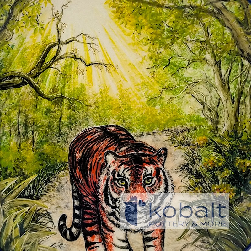 Talerz przedstawia dumnego tygrysa przechadzającego się między gęstymi roślinami oraz drzewami. Dziki kot kieruje swój wzrok prosto na nas. Przez korony drzew przebijają się olśniewające promienie słońca. Niezwykła precyzja z jaką został wykonany produkt oraz wykorzystane ciepłe barwy sprawiają, że przypomina on prawdziwy obraz. Z pewnością talerz będzie stanowił oryginalną i piękną ozdobę każdego wnętrza.