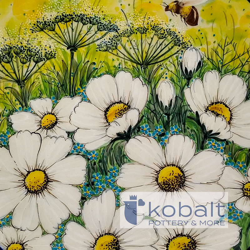 Talerz przedstawia scenę wyciętą prosto z polskiej łąki. Na produkcie widać drobną pszczołę w otoczeniu dużych białych kwiatów i zwiewnych dmuchawców. Tło tworzą bujne, zielone rośliny, nad którymi rozlega się słoneczne tło. Delikatne, pastelowe kolory idealnie ze sobą współgrają i są prawdziwą ucztą dla oczu. Niezwykła precyzja z jaką został wykonany talerz sprawia, że przypomina on prawdziwy obraz. Z pewnością produkt będzie stanowił oryginalną i piękną ozdobę każdego wnętrza.