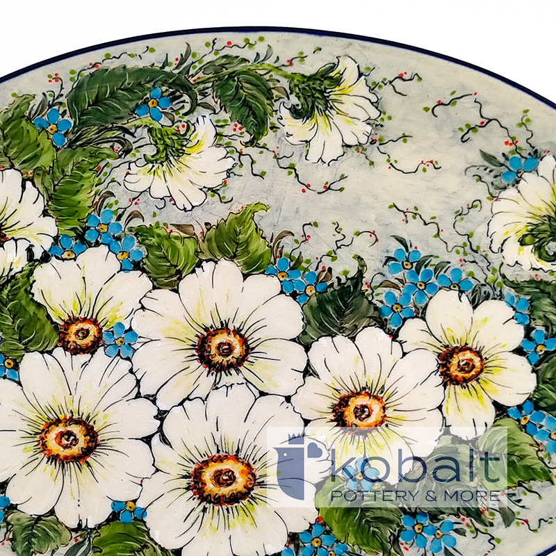 Półmisek przedstawia niezwykle piękne połączenie białych i niebieskich kwiatów z zielonymi liśćmi. Cudowne, żywe barwy tworzą bardzo spójne połączenie i są prawdziwą ucztą dla oczu. Niezwykła precyzja z jaką został wykonany produkt sprawia, że przypomina on prawdziwy obraz. Z pewnością półmisek będzie stanowił oryginalną i piękną ozdobę każdego wnętrza.