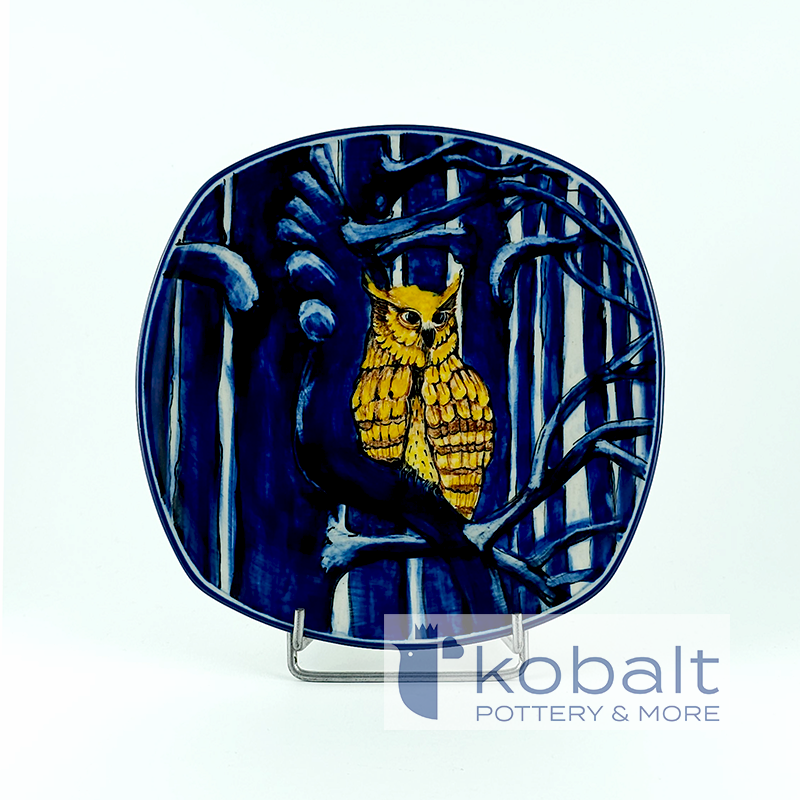 Na talerzu pięknie prezentuje się dostojna sowa w ciepłym, żółtym upierzeniu. Ptak znajduje się pośród kobaltowych drzew, przez które przebija się śnieżnobiałe tło. Całość tworzy tajemniczą, spokojną scenerią lasu. Niezwykła precyzja z jaką został wykonany produkt sprawia, że przypomina on prawdziwy obraz. Z pewnością talerz będzie stanowił oryginalną i piękną ozdobę każdego wnętrza.