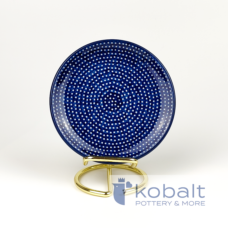 Talerz o średnicy 12,5 cm zdobiony w piękne, ręcznie malowane, granatowe kropeczki. Niewielki talerz idealnie sprawdzi się na drobne przekąski, kanapkę czy ciasto, a także jako podstawka pod kubek czy filiżankę. Ten unikatowy wzór będzie się pięknie komponować zarówno w rustykalnych jak i minimalistycznych, nowoczesnych wnętrzach. Talerz będzie stanowił oryginalną ozdobę każdej kuchni.