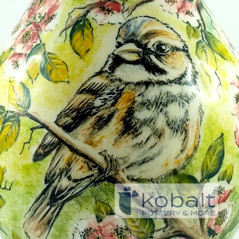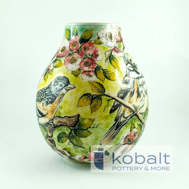 Niezwykła precyzja z jaką został wykonany produkt sprawia, że przypomina on prawdziwy obraz. Z pewnością wazon będzie stanowił oryginalną i piękną ozdobę każdego wnętrza. W tej dekoracji szczególnie wybija się elegancja białych kwiatów umieszczonych na tle drobnej zielono-niebieskiej roślinności. Góra wazonu zwieńczona żółtymi i utrzymanymi w ciemnej kolorystyce detalami dopełnia kompozycji, nadając jej wyrazistości i uroku.